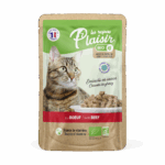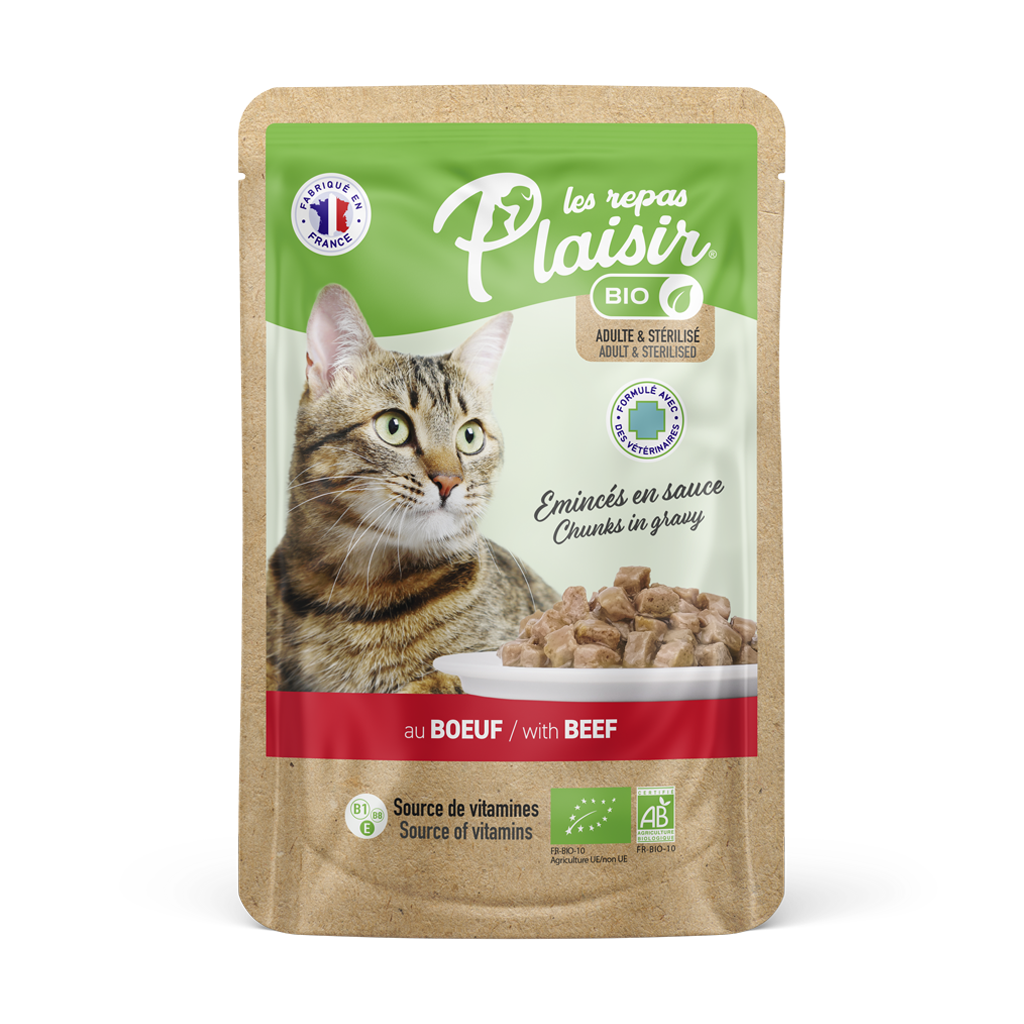 Our organic chunks in gravy with beef for cats are formulated to ensure maximum palatability and digestibility.