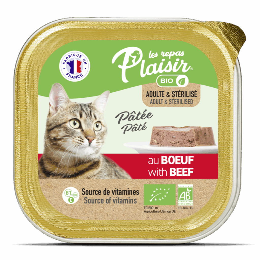 Our organic paté with beef for cats is formulated with no added grain and made with 95% animal-based protein.